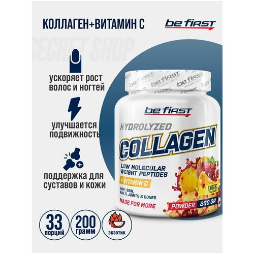 Collagen hydrolyzed + vitamin C powder от Be First содержит в составе коллаген и витамин С, являющиеся основными элементами соединительной ткани. Поддерживает здоровье суставов при больших физических нагрузках, например, высокоинтенсивных силовых тренировках. Добавка рассчитанане только на профессиональных спортсменов-силовиков, но и всех, кто занимается фитнесом для здоровья, или просто ведет активный образ жизни. Прием коллагена с витамином С окажет позитивное влияние на все виды соединительной ткани: не только сухожилия, связки и хрящи суставов, но и на эластичность сосудов, гладкость и упругость кожи. В спорте серьезные регулярные нагрузки приводят к повышенному износу суставов. Снизить вероятность такой ситуации позволяет прием коллагена в виде добавки с профилактической целью. Применение: смешайте 1 мерную ложку - 5,5 г с 200-250 мл воды или любого другого напитка. Принимать 1 раз в день. Для достижения наилучшего эффекта рекомендуется принимать продукт не менее месяца.
