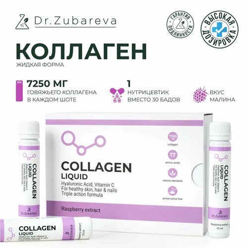 Коллагеновые шоты с витамином С, со вкусом малины, 14 штук, от Dr. Zubareva
