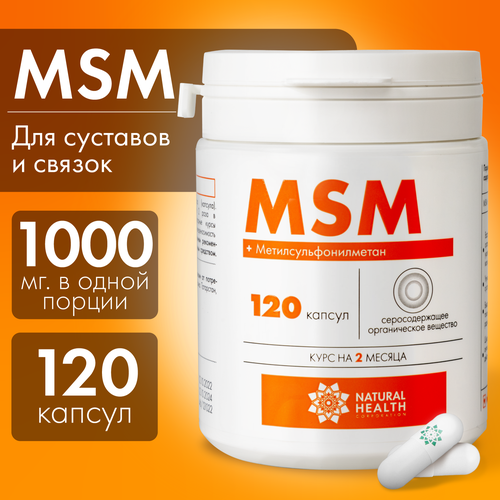 MSM витамин для суставов, хрящей, связок Natural Health метилсульфонилметан, серосодержащее вещество, 120 капсул