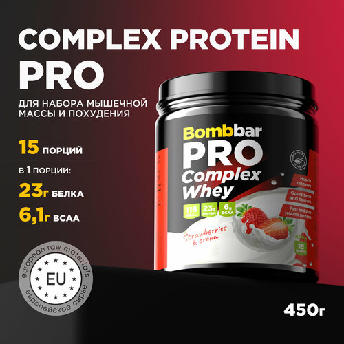Bombbar Pro Complex Whey Protein Многокомпонентный протеин без сахара "Клубника со сливками", 450 г