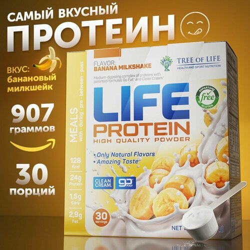 Протеин изолят сывороточный life Protein, Вкусный белковый коктейль "Банан" здоровое фитнес-питание для похудения, 907 гр, 30п.