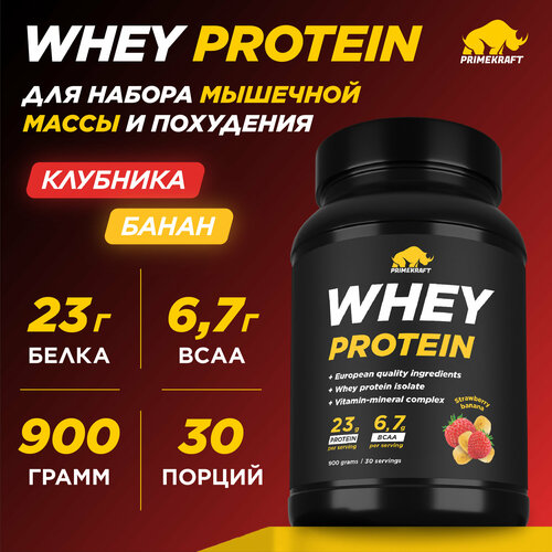Протеин сывороточный PRIMEKRAFT Whey Protein, Клубника-банан (Strawberry-banana), банка 900 г / 30 порций