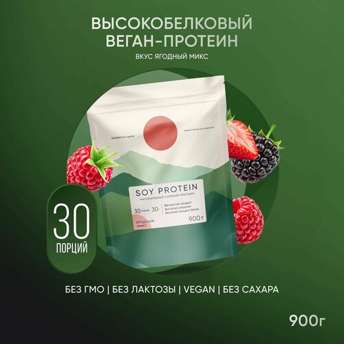 Веганский протеин, vegan protein, изолят для мышечной массы и похудения, без сахара, порошок, ягодный микс, 900 г