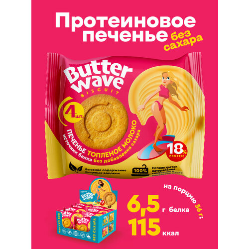 Протеиновое печенье без сахара "Butter Wave" Топленое молоко , коробка 32штуки (8 уп по 4шт)