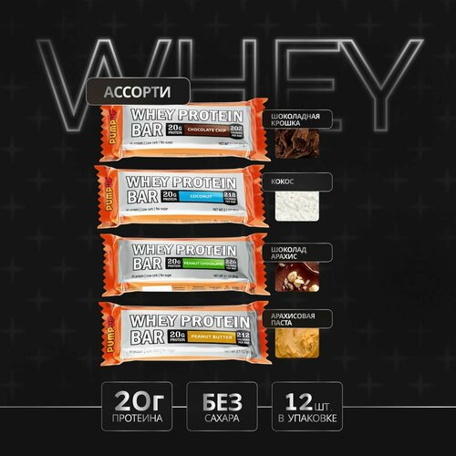 Протеиновые батончики "Ассорти" 12 шт PUMP UP . Полезное питание , батончик протеиновый с высоким содержанием белка .