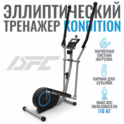 Эллиптический тренажер DFC Kondition выполнен в черном, синем и сером цветах, имеет размеры 125x56,5x156,5 см и вес 25,62 кг.