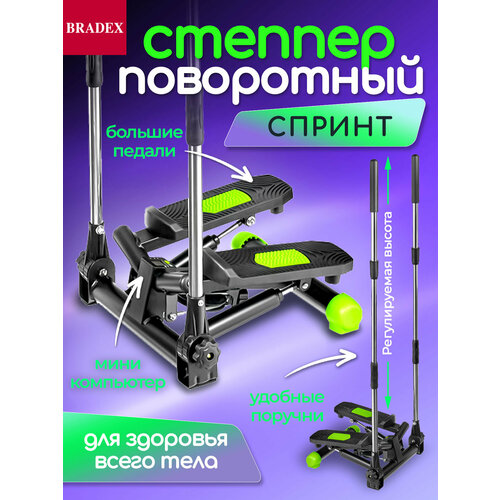 Степпер поворотный со складными поручнями, модель "Спринт" от бренда BRADEX. Многофункциональный педальный кардио тренажер, разработанный для аэробной тренировки, спорта и фитнеса, дома или в спортивном зале. Министеппер имитирует подъем по лестнице со ступени на ступень и отлично прорабатывает все группы мышц: ног, бедер, икр и ягодиц, а также задействует мышцы спины, талии, рук и пресса. Используется для похудения, интенсивного сжигания калорий, реабилитации и повышения здоровья. Упражнения на кардиотренажере укрепляют сердечно-сосудистую систему, улучшают микроциркуляцию крови, лимфодренаж и обмен веществ. Домашний мини степпер для ходьбы поможет сделать мышцы тела рельефными и сильными, справиться с лишним весом и гиподинамией. Избавиться от живота, боков и целлюлита, подтянуть и накачать попу. Спортинвентарь отличается оптимальным уровнем нагрузки до 15 кг, которую обеспечивают прочные гидравлические цилиндры. Стальная конструкция обладает высокой устойчивостью и выдерживает вес до 100 кг. Большие удобные педали имеют нескользящую поверхность, регулируются по высоте. Степ тренажер оснащен электронным дисплеем. На мониторе отражается вся необходимая информация: расход калорий, время тренировки, общее количество шагов, количество шагов в минуту. Складные поручни используются для дополнительной устойчивости и проработки рук, груди, предплечья. Компактный тренировочный инвентарь отличается эргономичным дизайном и хорошо вписывается в любой интерьер. Резиновые ножки защитят пол от царапин во время занятий.