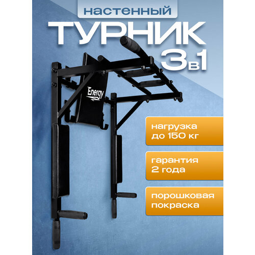 Турник-Брусья 3 в 1 "Energy" полностью заменит собой массу спортивных тренажеров и снарядов. Турник обладает компактными габаритными размерами, что позволяет сэкономить место даже в маленьком помещении. Турник изготовлен по принципу сборной стальной конструкции. Основа стальной конструкции - профиль 30х30 мм , что в сочетании с качественными крепежными элементами, обеспечивающими простоту монтажа изделия на стену, позволяет выдерживать нагрузку до 150кг. В производстве используются исключительно качественные, износостойкие материалы, прошедшие входной контроль.