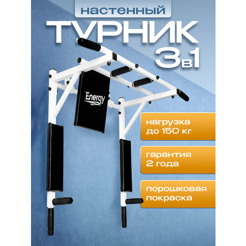 Турник-Брусья 3 в 1 "Energy" полностью заменит собой массу спортивных тренажеров и снарядов. Турник обладает компактными габаритными размерами, что позволяет сэкономить место даже в маленьком помещении. Турник изготовлен по принципу сборной стальной конструкции. Основа стальной конструкции - профиль 30х30 мм , что в сочетании с качественными крепежными элементами, обеспечивающими простоту монтажа изделия на стену, позволяет выдерживать нагрузку до 150кг. В производстве используются исключительно качественные, износостойкие материалы, прошедшие входной контроль.