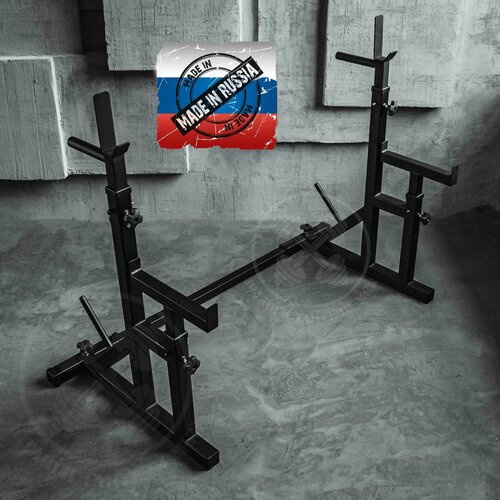 Стойки можно использовать как самостоятельный спортивный снаряд, так и в комплекте со скамьей. Вы сможете выполнять приседания со штангой, жим лежа, отжимания на брусьях, шведские подтягивания и другие упражнения.