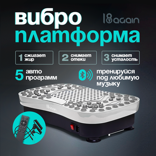 Чем еще вы можете насладиться, используя виброплатформу 18 AGAIN? У нее богатый функционал и дистанционное управление. Вы сможете регулировать скорость вибрации от 1 до 120 и тренировать одновременно верхнюю и нижнюю части тела с помощью 2 полос для тренировки с отягощениями. Виброплатформа также обладает 5 автоматическими программами для различных упражнений. Вам понадобится всего 10 минут в день, чтобы выполнить свои обычные тренировки и достичь лучшей формы, улучшенного метаболизма, крепкой костной ткани и сниженного уровня стресса.