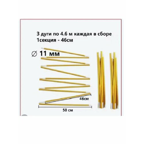 Дуга для палатки - это элемент конструкции палатки, который играет важную роль в ее устойчивости и прочности. Она представляет собой гибкую металлическую конструкцию, которая крепится к ткани палатки, чтобы придать ей форму. Гибкая конструкция дуги позволяет ей легко изгибаться и складываться в компактный размер для удобства транспортировки. Эластичная соединительная резинка проходит через все секции дуги. Длина секции зависит от общей длины дуги, но не более 51 см. Размеры указаны на фото. Диаметр дуги: 11 мм. Материал: алюминиевый сплав