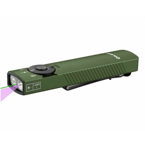 Ручной EDC фонарь Olight Arkfeld Pro OD Green с дополнительным ультрафиолетовым светодиодом 365 nm мощностью 580 mW зеленым лазерным целеуказателем. Основной светодиод белого света Osram P9 мощностью светового потока 1300 люмен и дальностью 102 метра. Arkfeld Pro питается от встроенного li-po аккумулятора емкостью 1500 mAh, который заряжается магнитным кабелем Olight MCC от USB выхода.