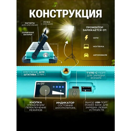 Прожектор светодиодный на солнечной батарее, кемпинговый фонарь