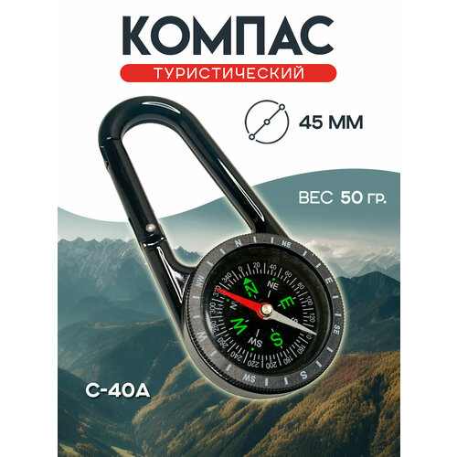 Компас туристический карманный C-40A с карабином, диаметром компаса 45 мм.