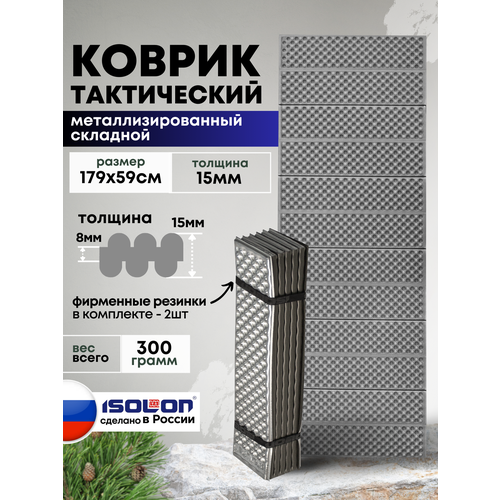 Туристический коврик Металлик Flex компактный складной коврик с хорошими показателями теплоизоляции разработан для активного отдыха — это универсальный аксессуар, который станет незаменимым помощником во время туристических походов и пикников, отдыха на пляже или рыбалки. Он обеспечит комфортное место для сидения или сна, защитит от влаги и холода, а также сохранит тепло в холодное время года. Этот складной коврик имеет толщину по верхним граням ячеистой поверхности 15 мм, что обеспечивает максимальный комфорт и эффективную термоизоляцию. Он выполнен из физически сшитого пенополиэтилена Isolon, экологичного материала, безопасного для контактов с кожей человека. Изолон обеспечивает мягкость и упругость. Пенка водонепроницаема, не впитывает влагу и грязь. Легко моется водой без использования чистящих средств. Уникальная конструкция позволяет легко и быстро его разложить и сложить обратно, что делает его компактным и удобным для переноски. Он занимает минимум места багажнике автомобиля, что особенно актуально во время поездок на природу или кемпинга. Размер в сложенном виде: 60 х 15 х 11 см. Он идеально подойдет для горных походов, охоты и рыбалки или путешествий на велосипеде. Не утяжеляет рюкзак туриста: вес всего 300 грамм. Более компактный, чем рулонные пенки. Легко складывается в 12 сложений и может быть использован как сидушка на привале или в лодке. Размер коврика в развернутом виде 179 х 59 см. Защищает от холода и сырости. Подходит для использования в помещении и на улице. Изготовлен на АО «Ижевский завод пластмасс», Россия.
