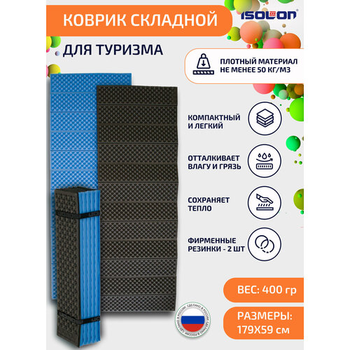 Коврик плотный складной для туризма и спорта Tourist Flex 179 х 59 х 1.5 см черный, синий