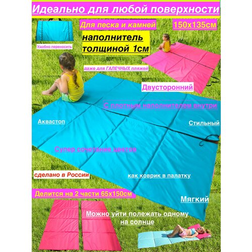 Наша авторская разработка. Большой, легкий, удобный, непромокаемый и мягкий пляжный коврик подойдет и как покрывало на каменистый пляж, коврик для галечного пляжа. Его можно разделить на 2 части, кто то может остаться на солнышке загорать, а кто-то в тени. Это очень удобно. Каждая из половин будет длиной 165 см, а шириной 72 см, такого размера достаточно для комфортного размещения одного взрослого человека. Так же Вы можете взять с собой его весь или только одну часть, у каждой половинки свои ручки. Его можно использовать как матрас в палатку или коврик в палатку, он плоский и занимает место, а еще, благодаря своему наполнителю не пропускает холод и не остывает. Его наполнитель имеет воздухонепроницаемую и влагонепроницаемую, закрытую пористую структуру, поэтому потери тепла и его остывание исключается. Этот матрас для пляжа очень легкий! При этом имеет толстый слой пенистого наполнителя, на котором будет комфортно лежать на любой поверхности! Произведено в России и только из качественных и безопасных материалов. Этот пляжный коврик не промокает, не впитывает грязь и воду, легко чистится, качественно сшит. Благодаря плотному наполнителю Вы получаете большое пляжное покрывало для камней, для песка, это подстилка для любых поверхностей.