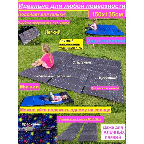Наша авторская разработка. Большой, легкий, удобный, непромокаемый и мягкий пляжный коврик подойдет и как покрывало на каменистый пляж, коврик для галечного пляжа. Его можно разделить на 2 части, кто то может остаться на солнышке загорать, а кто-то в тени. Это очень удобно. Каждая из половин будет длиной 150 см, а шириной 65 см, такого размера достаточно для комфортного размещения одного взрослого человека. Так же Вы можете взять с собой его весь или только одну часть, у каждой половинки свои ручки. Его можно использовать как матрас в палатку или коврик в палатку, он плоский и занимает место, а еще, благодаря своему наполнителю не пропускает холод и не остывает. Его наполнитель имеет воздухонепроницаемую и влагонепроницаемую, закрытую пористую структуру, поэтому потери тепла и его остывание исключается. Этот матрас для пляжа очень легкий! При этом имеет толстый слой пенистого наполнителя, на котором будет комфортно лежать на любой поверхности! Произведено в России и только из качественных и безопасных материалов. Этот пляжный коврик не промокает, не впитывает грязь и воду, легко чистится, качественно сшит. Благодаря плотному наполнителю Вы получаете большое пляжное покрывало для камней, для песка, это подстилка для любых поверхностей.