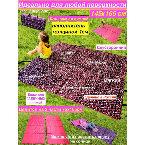 Наша авторская разработка. Большой, легкий, удобный, непромокаемый и мягкий пляжный коврик подойдет и как покрывало на каменистый пляж, коврик для галечного пляжа. Его можно разделить на 2 части, кто то может остаться на солнышке загорать, а кто-то в тени. Это очень удобно. Каждая из половин будет длиной 165 см, а шириной 72 см, такого размера достаточно для комфортного размещения одного взрослого человека. Так же Вы можете взять с собой его весь или только одну часть, у каждой половинки свои ручки. Его можно использовать как матрас в палатку или коврик в палатку, он плоский и занимает место, а еще, благодаря своему наполнителю не пропускает холод и не остывает. Его наполнитель имеет воздухонепроницаемую и влагонепроницаемую, закрытую пористую структуру, поэтому потери тепла и его остывание исключается. Этот матрас для пляжа очень легкий! При этом имеет толстый слой пенистого наполнителя, на котором будет комфортно лежать на любой поверхности! Произведено в России и только из качественных и безопасных материалов. Этот пляжный коврик не промокает, не впитывает грязь и воду, легко чистится, качественно сшит. Благодаря плотному наполнителю Вы получаете большое пляжное покрывало для камней, для песка, это подстилка для любых поверхностей.