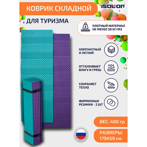 Коврик плотный складной для туризма и спорта Tourist Flex 179 х 59 х 1.5 см бирюзовый, фиолетовый