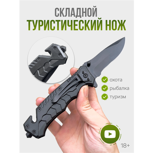 Нож складной тактический, со стропорезом и стеклобоем, цвет - черный