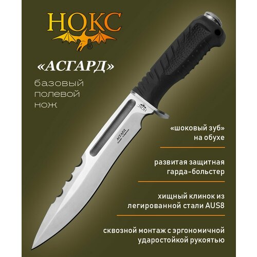 Нож с фиксированным клинком Асгард Нокс относится к категории «нож выживания» и представляет собой тактический полевой нож, клинок которого изготовлен из высоколегированной нержавеющей стали AUS8 и имеет твердость 56–58 HRC. Задуман он был в качестве основного полевого ножа, пригодного для максимального количества задач - разделки мяса, чистки рыбы, работы по дереву, организации лагерной стоянки или для нарезки продуктов и прочих бытовых нужд. Мощный клинок имеет форму «spear-point» с понижением линии обуха, поэтому, несмотря на размеры, «Асгард» отлично колет. А лезвие с ятаганным изгибом существенно повышает режущие свойства. Тонкие, хирургически точные манипуляции возможны благодаря специальной выемке «чойлу» для указательного пальца. "Асгард» обладает полноценной гардой в виде широкой стальной пластины. Эргономичная рукоять из твердой резины имеет сквозной монтаж; навершие-гайка выполняет функции стеклобоя, а при необходимости ее можно снять и разобрать нож. Для удобства хранения и ношения Асгард комплектуется ножнами из кордуры с пластиковой вставкой. На рукоятке имеется отверстие под темляк. Дизайн разработан Александром Бирюковым.