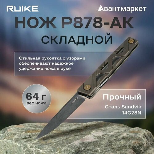 Клинок складного ножа Ruike P878-AK выполнен из шведской стали 14C28N, закаленной до твердости 57~59 HRC. Благодаря оптимальному химическому составу эта марка стали сочетает высокую твердость с отличной устойчивостью к коррозии, что позволяет надолго сохранить остроту лезвия. При этом материал обладает легкостью в заточке и долговечностью.