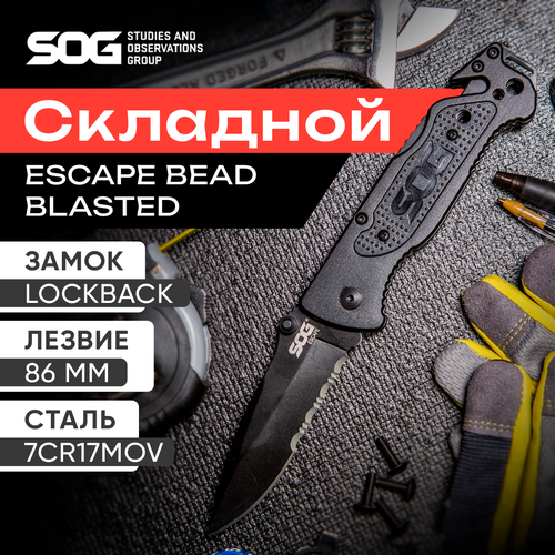 Escape Bead Blasted — туристический складной нож от компании SOG. Несмотря на рукоять из алюминия, нож довольно легкий и удобный в использовании. Клинок выполнен из стали 7Cr17Mov, имеет форму drop point. Оснащен замком back-lock, фиксирующим нож в открытом состоянии. Этот многофункциональный ножик отличный вариант как для повседневных (EDC) карманных ножей, так и для ножей, предназначенных для охоты, рыбалки и туризма. Для удобного хранения и переноса на рукояти предусмотрена клипса, также имеется отверстие для темляка.