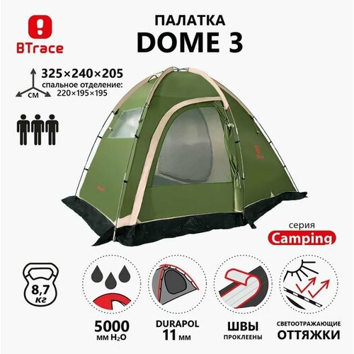 Палатка кемпинговая трёхместная Btrace Dome 3, зеленый