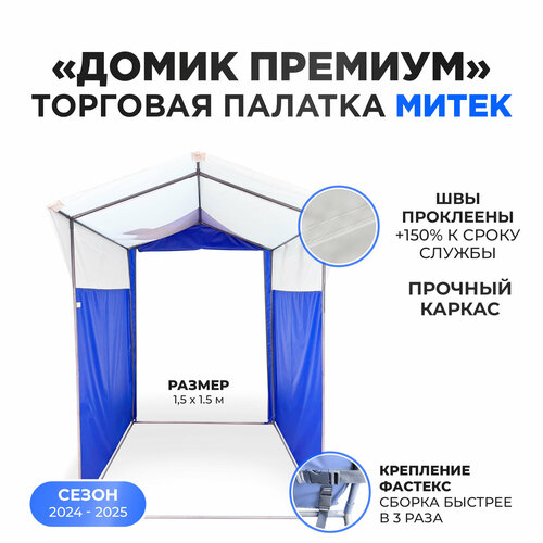 Палатка торговая Митек "Домик Премиум" бело-синяя (1,5х1,5, каркас из трубы Ø 18 мм, проклейка швов + стропа)