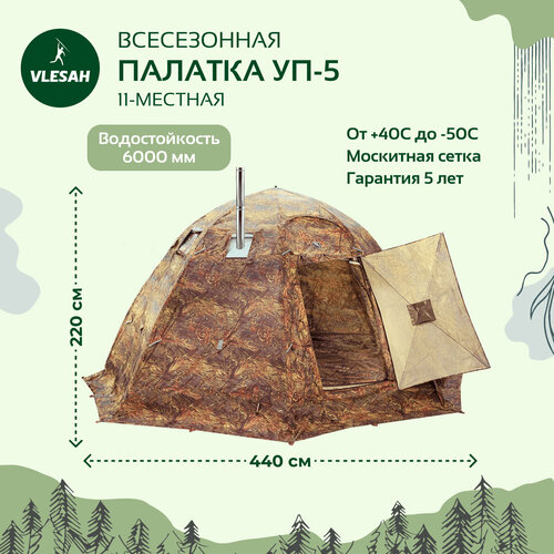 Универсальная палатка Берег УП-5 двухслойная быстросборная палатка шатрового типа на восьмилучевом алюминиевом каркасе. Палатка УП-5 с комфортом разместит до 11 человек в спальных мешках и до 5 человек при использовании раскладушек. Палатка УП-5 станет отличным выбором для охоты, рыбалки и туризма в любое время года.