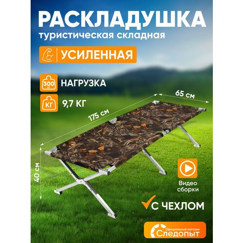 Раскладушка туристическая «Следопыт» в чехле – отличный выбор для тех, кто любит комфорт в походе, на рыбалке или на даче. Усиленная металлическая конструкция. Ткань GERDA CAMO - смесовая камуфляжная ткань из высококачественного хлопка и полиэстера, с водоотталкивающей пропиткой для защиты от дождя и ветра. В сложенном виде достаточно компактна и не занимает много места при транспортировке и хранении.
