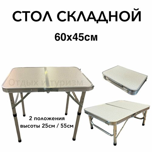 Стол кемпинговый складной, размер 45*60*25/55см, НЕ путайте С шириной 40см и высотой 50см. Ф18мм, материал: пластик/металл(алюминий). Идеальный вариант для семейного активного отдыха, рыбалки. Этот небольшой стол выручит в любой ситуации: на нем можно разложить снасти, приготовить обед и перекусить. Стол имеет удобную ручку для переноски. Каркас стола выполнен из алюминия, ножки из стальной трубы диаметром 18 мм. Стол складывается в компактный чемодан с удобной ручкой, ножки внутри стола крепятся на клипсы.