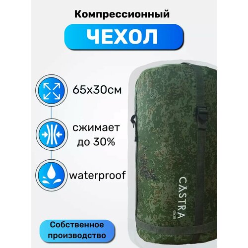 Компрессионный чехол предназначен для упаковки спального мешка и компактного хранения любых вещей в походе - в него можно сложить не только спальник, но и верхнюю одежду и любое другое снаряжение, которое в обычном виде занимает большой объем рюкзака. На донышке чехла есть ручка для переноски, донышко усилено стропами. Стропы утяжки образуют силовой каркас. Стягивание происходит при помощи пряжек. Горловина утягивается шнуром и фиксатором. Размер - 65х30 см./на подарок/мешок/армейский спальник/ уставной мешок/ рюкзак/ в поход/ на рыбалку/ хранение/ хранение вещей/