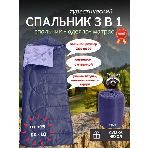 Спальный мешок туристический для похода и отдыха до -10 серый 3 в 1