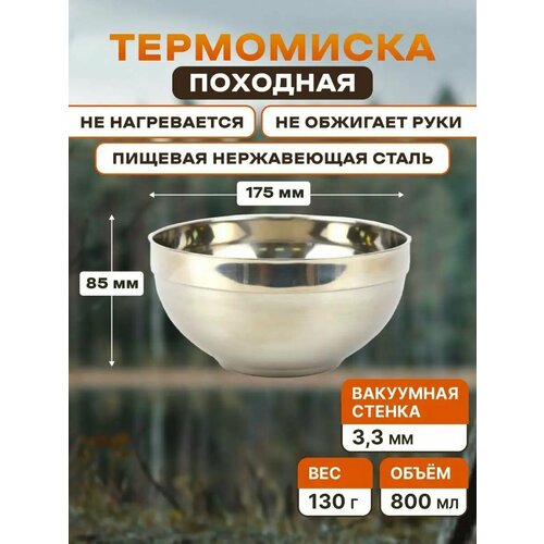 Миска из нержавеющей стали для похода. Объем 800 мл диаметр 176 мм высота 85 мм вес 150 г. Изготовлена по ГОСТ 27002-2020 из коррозионностойкой стали. Прекрасно подойдет в качестве походной посуды. Благодаря двойным изотермическим вакуумным стенкам внешняя сторона тарелки не нагревается от горячей пищи. Не обжигает и её очень удобно держать в руках.