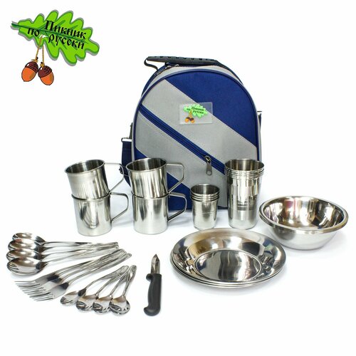 Отличный подарок для любителей активного отдыха и выездов на природу. Комплект посуды на 4 персоны очень просто и эргономично упаковывается в совсем небольшую сумку (доступна в разных цветах). Благодаря тому, что каждому предмету в ней отведено строго определенное место, вы точно ничего не забудете, собираясь в дорогу. Все входящие в набор кружки, стаканы, тарелки, миски и столовые приборы изготовлены из нержавеющей стали, они практически ничего не весят, а потому кейс можно поручить нести даже маленькому ребенку . Ремень для ношения через плечо удобно регулируется под любой рост.