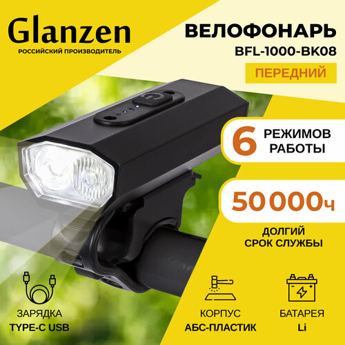 Светодиодный фонарь для велосипеда передний с 6 режимами 1000 Лм GLANZEN BFL-1000-BK08