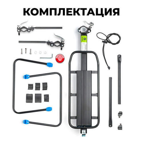 Багажник для велосипеда Rockbros HJ10011 легко устанавливается на подседельный штырь и вилку заднего колеса. Закрепляется с помощью металлических быстроразъемных зажимов. Быстро снимается и благодаря компактным размерам — легко убирается в рюкзак. В комплекте предусмотрено все необходимое для его сборки и установки. Велосипедный багажник подойдет для велосипедов с любым диаметром колес, дисковыми и V-образными тормозами. Главное, чтобы на подседельном штыре было свободное место для его установки. Он выполнен из прочного алюминия, а потому выдержит нагрузку до 50 кг. Надежно закрепляется и не болтается во время использования, и подходит для перевозки, как тяжелых грузов, так и людей. Багажник имеет небольшой вес и компактные размеры. Его поверхность покрыта нестираемой краской, которая устойчива к влаге и погодным изменениям. По бокам предусмотрены специальные ограничители. Сзади размещен светоотражатель, который обеспечит безопасность на дороге в темное время суток.