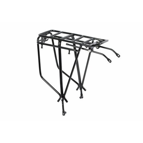Задний алюминиевый багажник с классическим болтовым креплением на перья подходит для велосипедов с колесами диаметром 26−29″. Такой велобагажник дает возможность перевозить достаточно тяжелые грузы, для удобства предусмотрено крепление для велосумки-«штанов», которая позволяет равномерно распределить вес груза. Максимальная нагрузка — 25 кг.