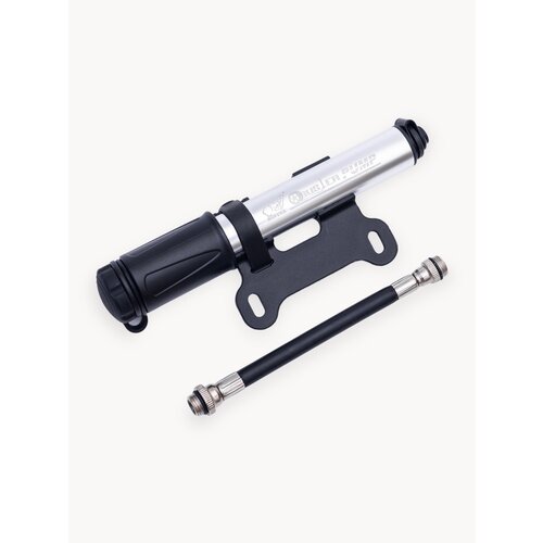 Насос имеет серебристый и черный цвет, что делает его стильным и практичным аксессуаром для вашего велосипеда.