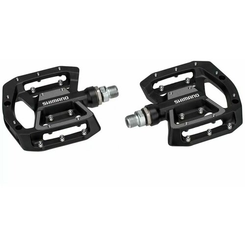Надежные педали-платформы Shimano GR500. Корпус педалей выполнен из алюминия, ось хром-молибденовая, герметичный обслуживаемый механизм подшипников. По 18 сменных шипов на педале. Замечательный вариант как для катания в экстремальных дисциплинах MTB, так и для туризма.