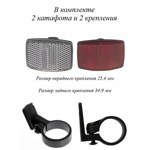 Комплект передних и задних отражателей включает 2 отражателя в красном и белом цветах и 2 крепления. Отражатели подходят для большинства велосипедов, поэтому вам не придется беспокоиться, слишком ли они большие или слишком маленькие для вашего велосипеда. Катафот изготовлен из качественного пластика, долговечного и водостойкого, который может оставаться в хорошем состоянии после длительного использования. Катафот легко чистить из-за гладкого материала, это не занимает слишком много времени. Чтобы установить предупредительный отражатель безопасности велосипеда, вам нужно взять отвертку, ослабить гайку от винта и фиксировать отражатели там, где вы хотите, на ручке или под держатель сиденья. Набор отражателей может сделать ваш велосипед более особенным, так что вы можете быть легко замечены пешеходами и водителями на дороге, уменьшая риск дорожно-транспортных происшествий. Размер светоотражателя: 5,3 - 3,5 см. Диаметр крепления 27-32 мм. Внимание: крепления отличаются друг от друга.