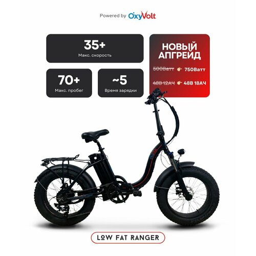 Oxyvolt Low Fat Ranger – электрический фэтбайк. Его компактные 20-дюймовые колеса «обуты» в фирменные агрессивные покрышки Chaoyang, ширина которых составляет 4 дюйма. Этот велосипед создан для тех, кто любит езду по бездорожью: по песку или грязи, снегу, траве, каменистым ландшафтам. У него прочная складная алюминиевая рама, что облегчает хранение и перевозку транспортного средства.