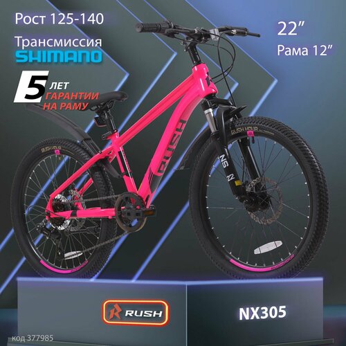 Велосипед детский горный дисковый 22" рост 125-140см 6 скоростей розовый рама 12" велик 9 лет 7 лет 8 лет переключатель SHIMANO скоростной RUSH HOUR NX 305