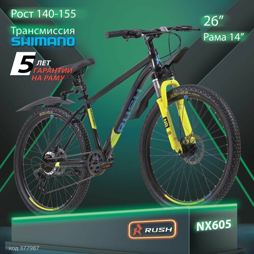 Горный подростковый велосипед RUSH NX605 26" дюймов с дисковыми тормозами подойдет для мальчиков и девочек ростом 140-155 см. Рама хардтейл 14" с заводской гарантией 5 лет изготовлена из высоколегированной стали HI-TEN с применением технологии техноформинга и внутренней проводки тросов. Трансмиссия 7 скоростная, задний переключатель SHIMANO TY200, на руле манетки RUSH HOUR EF-41(комбиручки). Вилка серии NS пружинно-эластомерная с ходом 70 мм, обеспечит больший комфорт при катании. На штанах вилки установлены пыльники, которые защищают хромированные ноги от воздействия пыли и грязи. Двойной алюминиевый обод рассчитан на нагрузку до 120 кг. Премиум покрышки MOUNTAIN CONTROL шириной 2,35" обеспечат отличный накат и сцепление с дорогой. Мягкое сиденье с покрытием SOFT TOUCH регулируется по высоте без ключей, с помощью эксцентрика. Вес велосипеда 16 кг. На нижней трубе есть крепеж для держателя бутылки или насоса. Крылья, подножка и защита цепи в подарок. Мы контролируем все этапы создания велосипедов RUSH HOUR: контроль входящих комплектующих; правильность установки и настройки оборудования; взвешивание; проверка комплектности и правильности упаковки. RUSH HOUR NX 605 код 377987