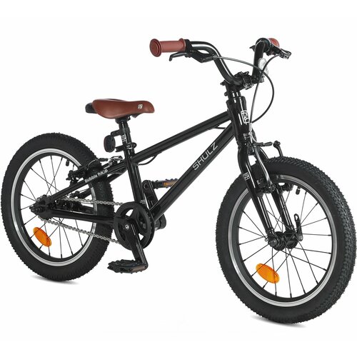 У сиденья есть специальная ручка: за нее родители могут поддерживать малыша, пока он катается неуверенно. Зубастые покрышки можно накачать обычным автонасосом и ездить как по асфальту, так и по грунтовым дорожкам парка. В комплекте звонок и катафоты, а на раме — светоотражающие надписи, чтобы юный велосипедист был заметнее на дороге.