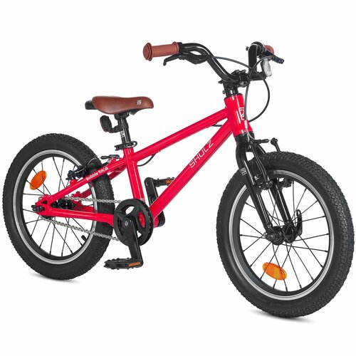У сиденья есть специальная ручка: за нее родители могут поддерживать малыша, пока он катается неуверенно. Зубастые покрышки можно накачать обычным автонасосом и ездить как по асфальту, так и по грунтовым дорожкам парка. В комплекте звонок и катафоты, а на раме — светоотражающие надписи, чтобы юный велосипедист был заметнее на дороге.