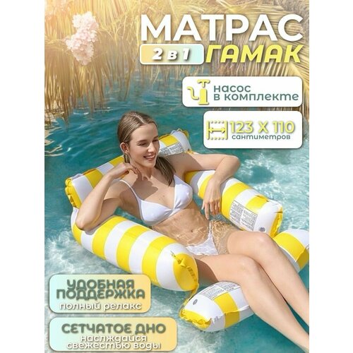 Оригинальный матрас-гамак для плавания с сеткой и надувной подушкой, предназначен для всех возрастов, чтобы расслабиться на пляже и в бассейне, насладиться плаванием. Компактный матрас не занимает много места и не требует особых усилий для надувания, его легко надуть ручным насосом, который идёт в подарок. Несмотря на свои небольшие размеры, этот плавательный матрас достаточно прочен и устойчив в воде, выдерживает плавающий вес до 120 кг. Преимущество этой модели в том, что часть тела можно погрузить в воду, как в кресло и защитит тело от перегревания на жарком солнце. Может использоваться в качестве гамака для плавания, в виде кресла для плавания, матрасика для плавания, подушки для плавания, как нудл для плавания. Необычный пляжный матрас заменит стандартный надувной матрас и плавательный круг. Ручной насос поставляется к комплекте. Хит этого лета — надувной матрас-гамак с сетчатым дном сделает ваш отдых незабываемым! Дно матраса для плавания изготовлено из прочной сетки, которая надежно поддерживает тело в воде, обеспечивает комфорт и безопасность. Благодаря погружению в воду нет риска перегрева на солнце. Наслаждайтесь еще больше, чем обычно свежестью воды знойным летним днем! Матрас-гамак оснащен четырьмя воздушными камерами: подголовником, поддержкой для ног и двумя боковинами-подлокотниками. Оригинальная форма и красочная расцветка добавит яркости отдыху на пляже, реке или бассейне. Легкий и компактный надувной матрас для плавания легко поместится в чемодан или рюкзак. Ручной насос, поставляемый в комплекте, поможет без труда надуть его . Размер матраса подходит для взрослых и детей. Обращаем ваше внимание, что дети должны находиться на воде под присмотром взрослых. Размер изделия в надутом виде 105*95см, предельная нагрузка 120кг. Настройтесь на нужную волну этим летом, проведите с удовольствием отпуск или каникулы! Матрас для бассейна, для пляжа. Оригинальная форма и красочная расцветка добавит яркости отдыху на пляже , реке или бассейне. Легкий и компактный надувной матрас легко поместится в чемодан или рюкзак. Ручной насос, поставляемый в комплекте, поможет без труда надуть его Надувной матрас для плавания большой - идеальное решение для комфортного отдыха на пляже или у бассейна. Наш плавательный матрас для купания будет выделяться на любом водоеме и реке. Компактный и удобный матрас для моря позволяет с легкостью носить его, даже если вы устроились далеко от пляжа. Плавательный матрасик подойдет вместо круга и будет радостью для малышей, мальчиков и девочек, которые любят кататься на плотах и проводить время на воде. Матрас пляжный станет незаменимой вещью для подростков, кто ценит комфорт на море или океане.